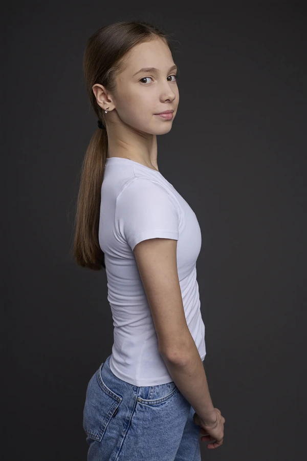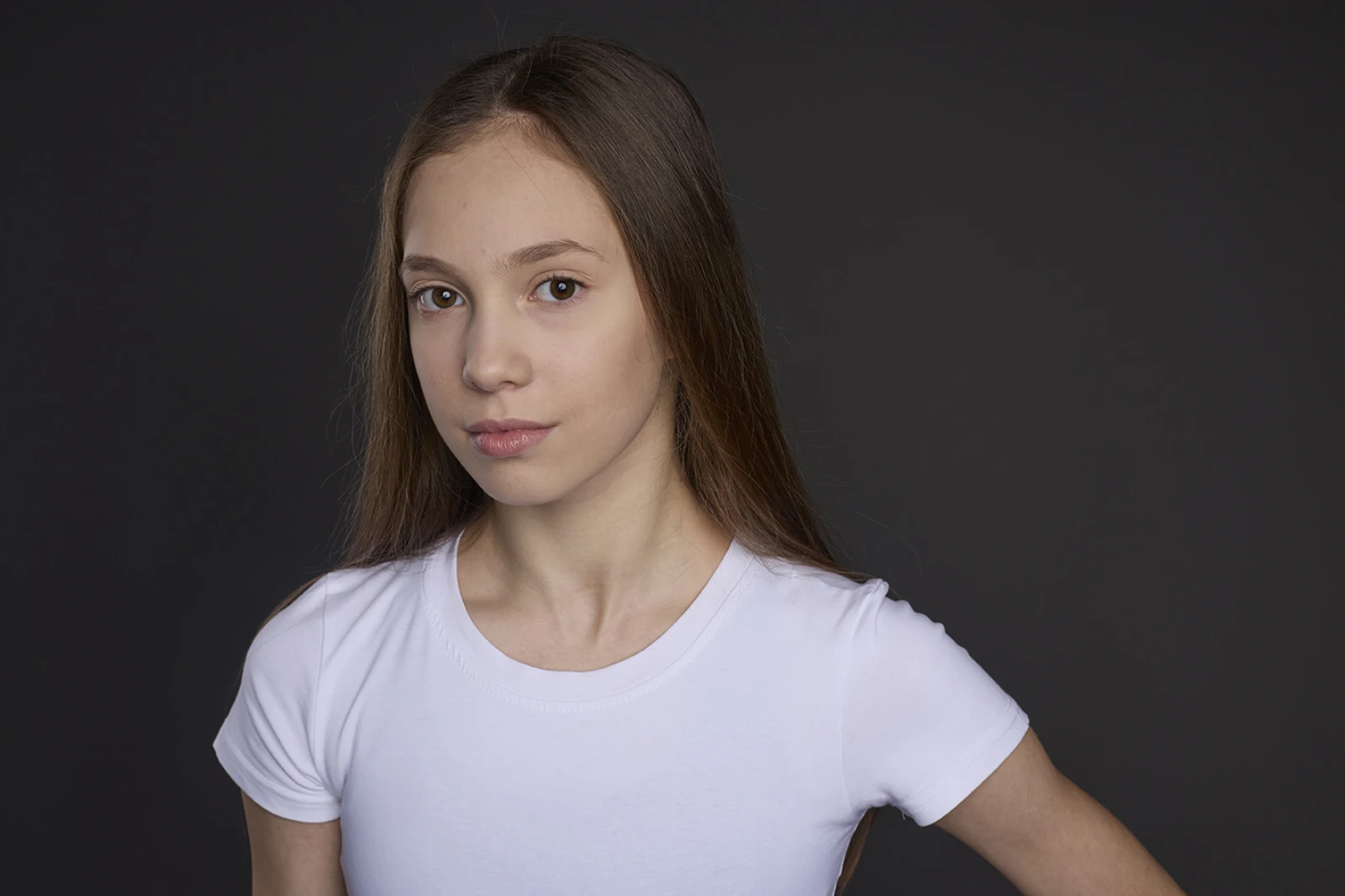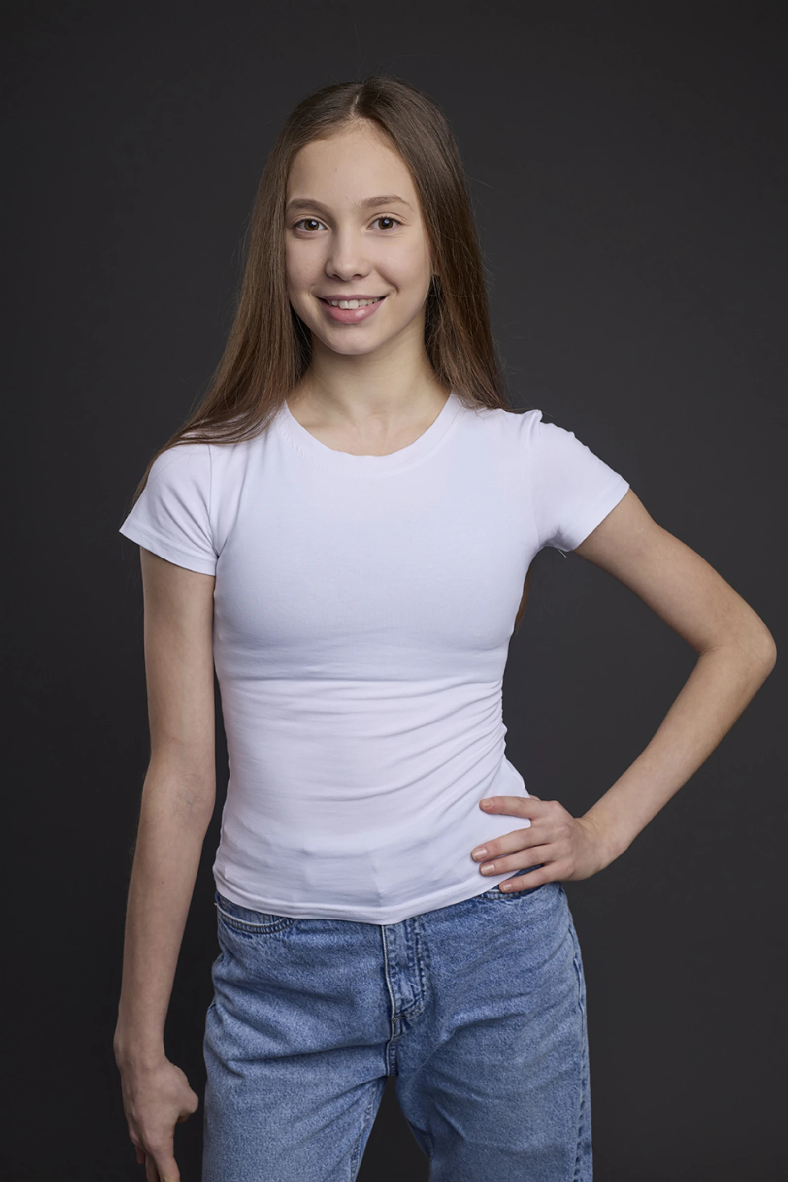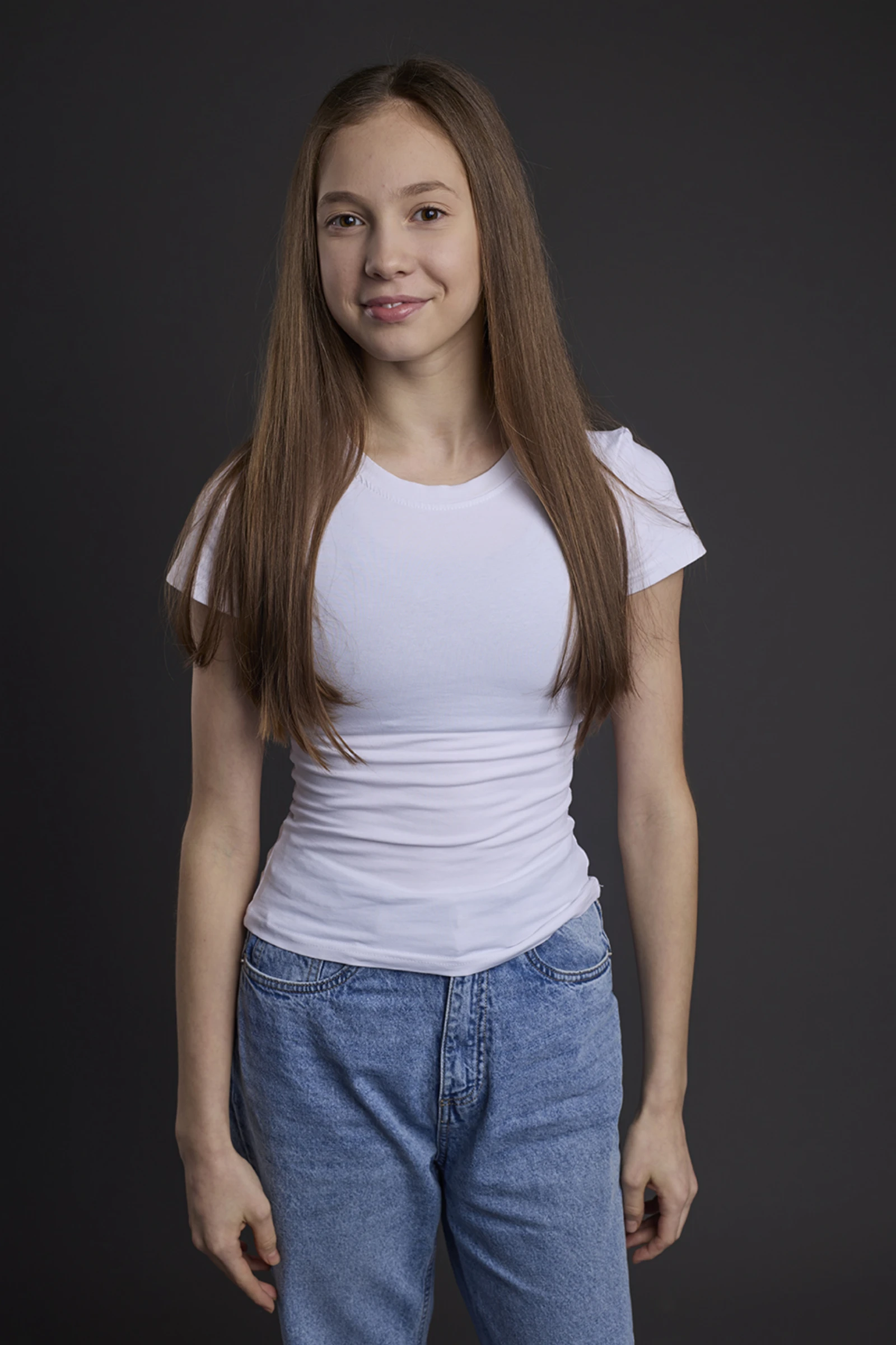 Занимается художественной гимнастикой. Собранная, дисциплинированная, улыбчивая, уверенно чувствует себя перед камерой.